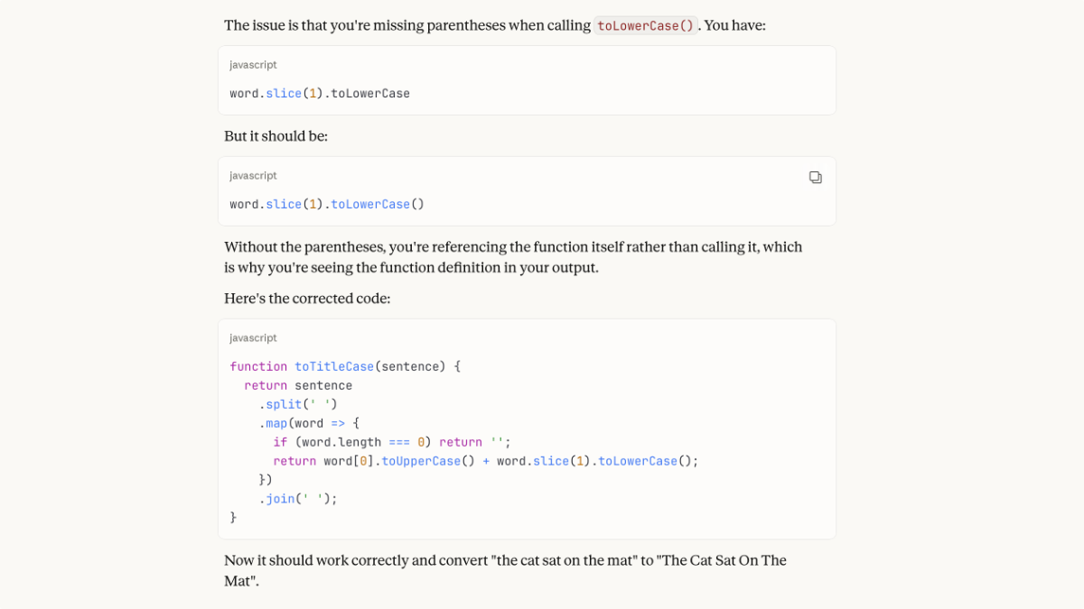 Let’s paste the function directly into Claude (or ChatGPT, or your preferred web-based assistant) and ask what’s wrong with it. It’s also a good idea to paste the error/failing test so it has some more context.